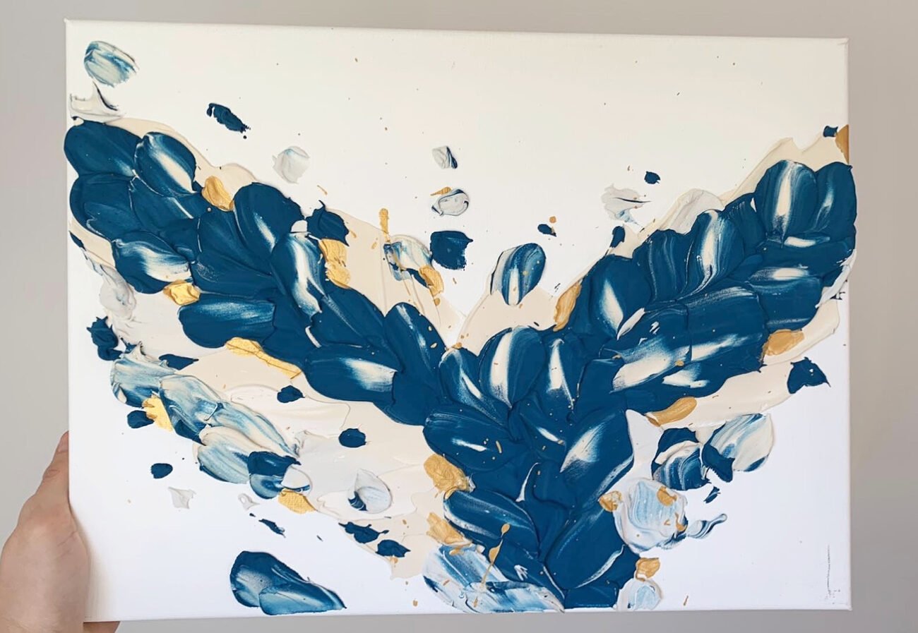 Un tableau texturé dans les tons de bleus représentant une queue de baleine