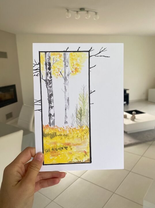 Les bouleaux, avec leur écorce blanche distinctive, sont mis en valeur dans cette aquarelle. Leurs troncs minces et élancés créent une atmosphère délicate et élégante. Les couleurs automnales, allant du jaune doré à l’orange vif, sont subtilement mélangées pour créer une palette chaleureuse et vibrante.