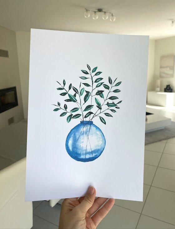 Voici notre aquarelle représentant une plante délicate dans un vase bleu. Cette aquarelle met en valeur la beauté naturelle d’une plante, avec ses couleurs et ses détails délicats. Les nuances de vert se mêlent harmonieusement, créant une composition visuellement attrayante.