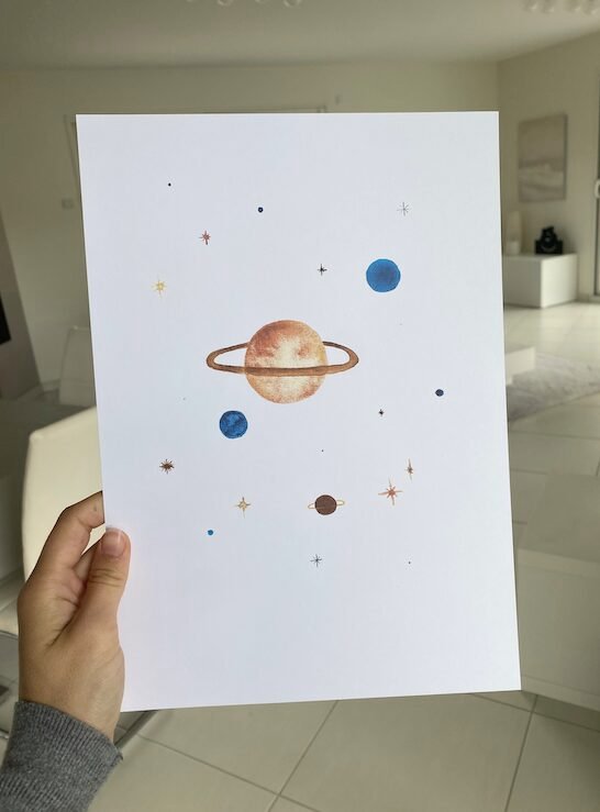 Nous sommes ravis de vous présenter notre aquarelles représentant la planète saturne dans notre galaxie. Chaque détail est minutieusement peint, donnant vie à chaque planète avec précision. Notre aquarelle apportera une touche artistique et fascinante à n’importe quelle pièce de votre maison ou de votre bureau.