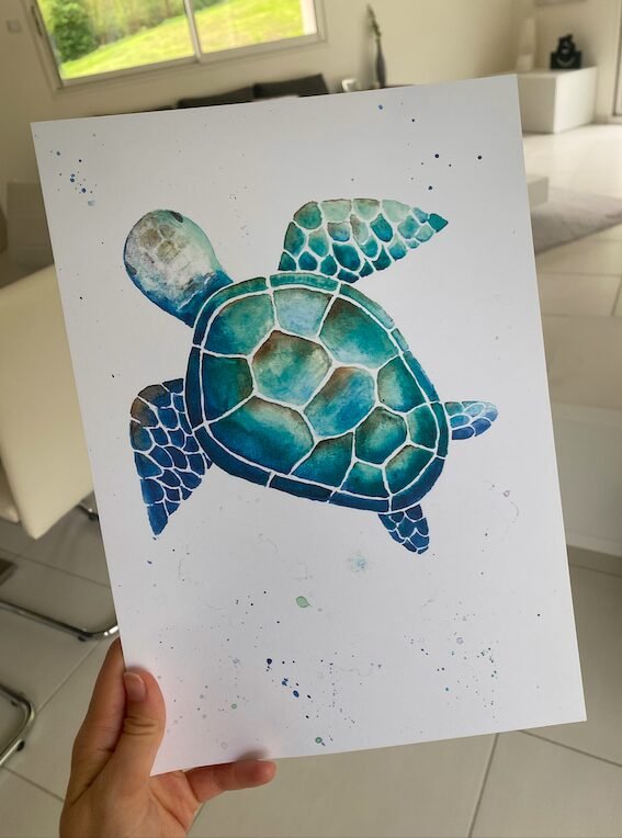 Offrez-vous cette aquarelle représentant une tortue de mer et laissez-vous transporter dans l’univers fascinant des fonds marins.